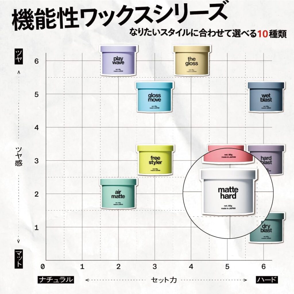 ドライワックスなどとも呼ばれ仕上がりはツヤ感のないふわっとしたナチュラルスタイリングが可能。