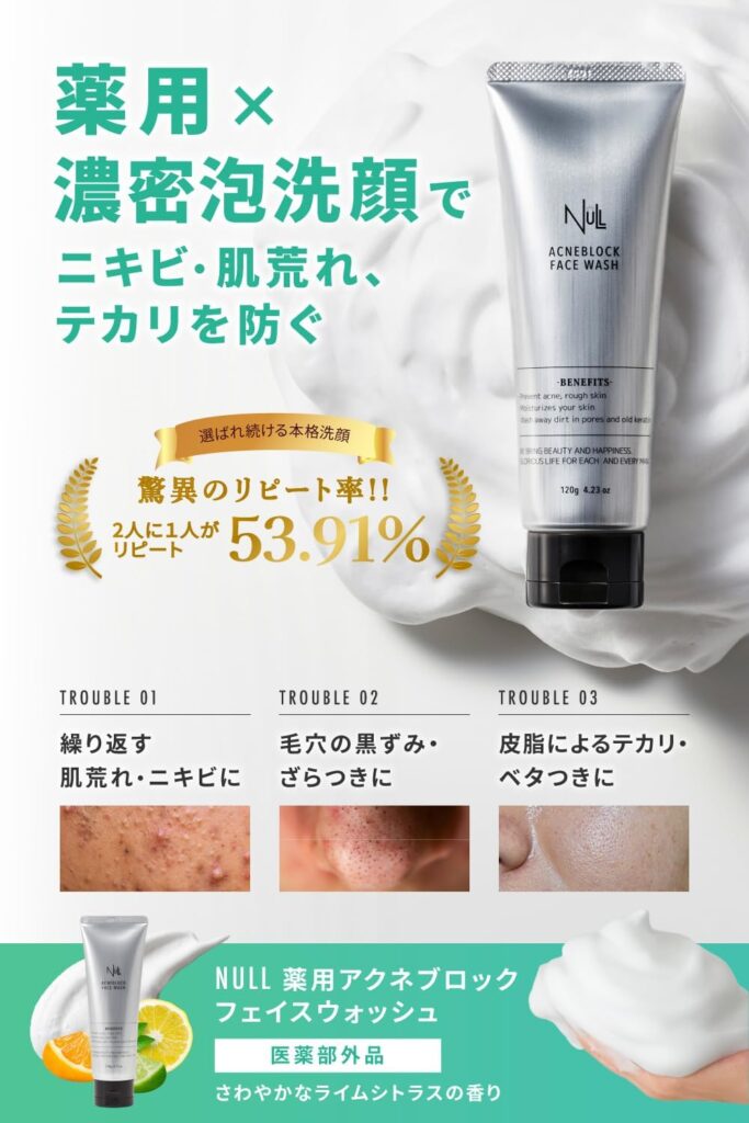 テカリが出やすい人は“落としきれていない”か、“落としすぎて皮脂が逆に出ている”かのどちらか。NULLの薬用洗顔は、さっぱり感がありつつつっぱりにくいバランスを狙っているので、朝の洗顔にも向いています。