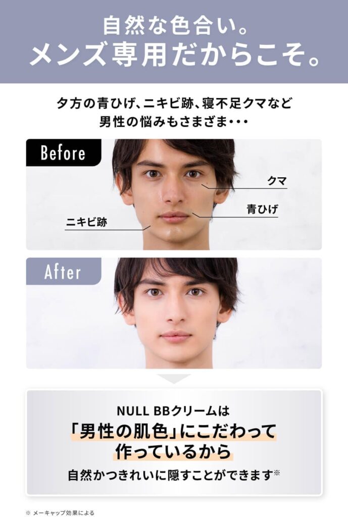 NULLのBBはカバー力がありつつ自然。米粒2つ分を薄く伸ばすだけで、青ヒゲや色ムラを和らげます。特に口周りのトーンが整うと、全体の清潔感が一段上がります。