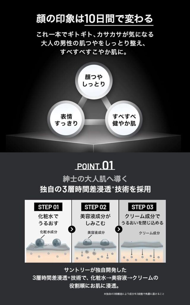 ギトギト・カサカサが気になる大人の男性の肌つやをしっとり整え、すべすべすこやか肌へ」という訴求が目を引く!