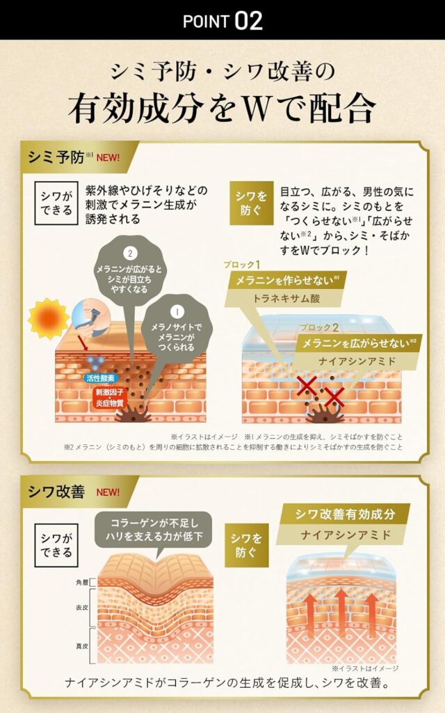 • マスターズブレンドのシミ予防・シワ改善モデルでは、トラネキサム酸+ナイアシンアミドが有効成分として配合されています。